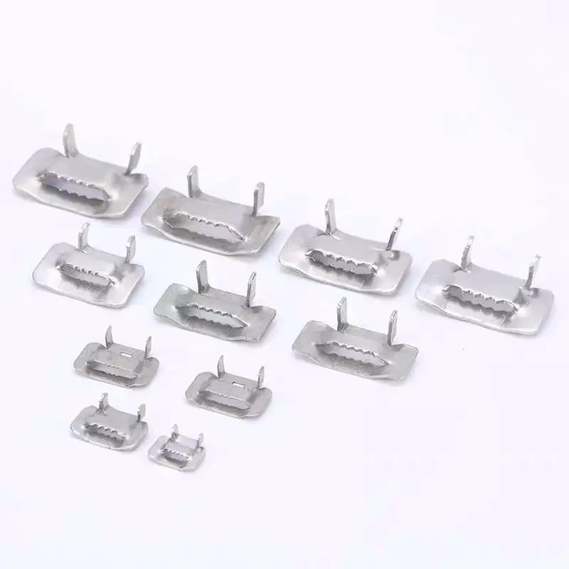 Stainless steel banding buckles,other called stainless steel clips used in fastening solutions with band strapping to attach industrial fittings,anchoring and suspension assemblies and other devices to the poles with LV,HV,ABC cable fittings,with fiber optic cable accessories in construction of passive optical networks,in marine and railway transportation,mining,oil and gas industries,fixing sings to power line.